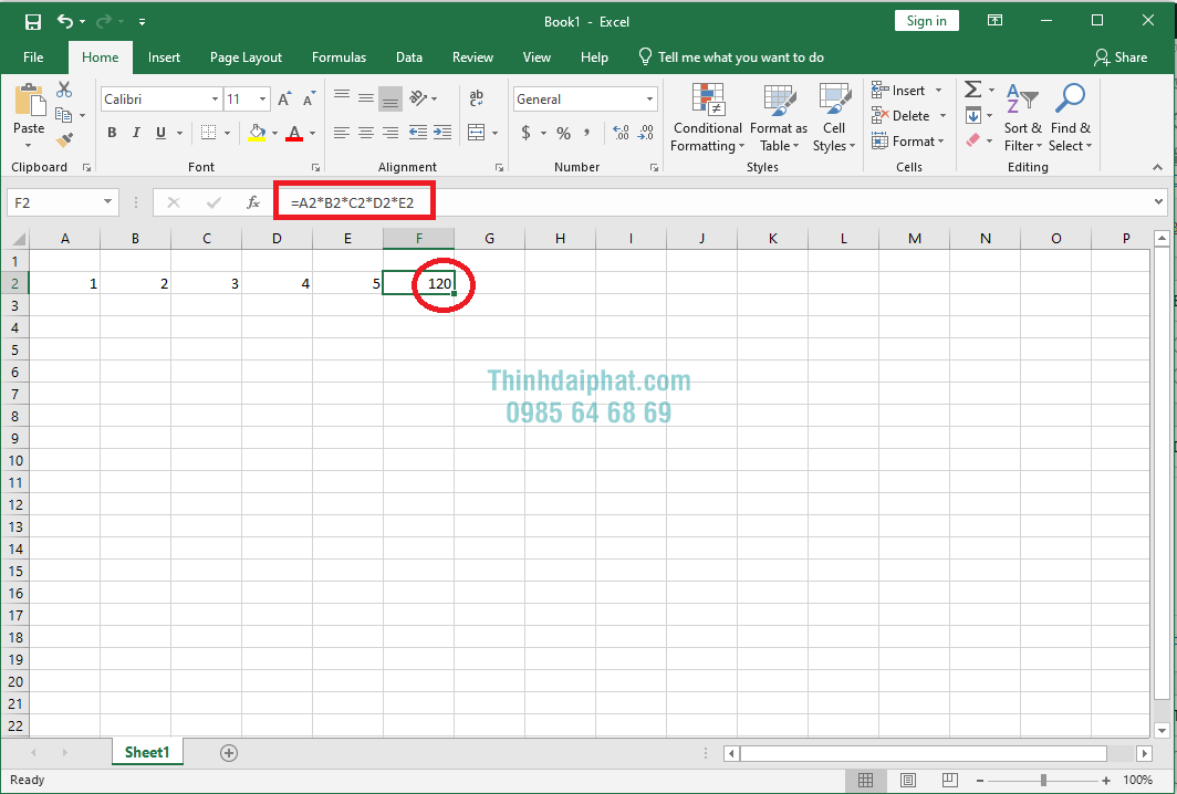 Ngoài ra các bạn có thể thực hiện theo cách thứ hai như sau, cách này có thể áp dụng cho tất cả các phép Cộng (+), Trừ (-), Nhân (*), Chia (/): để nhân tất cả các số từ A2 đến E2 ta nhập cú pháp =A2*B2*C2*D2*E2 sau đó ta nhân Enter sẽ cho ra được kết quả là 120.
