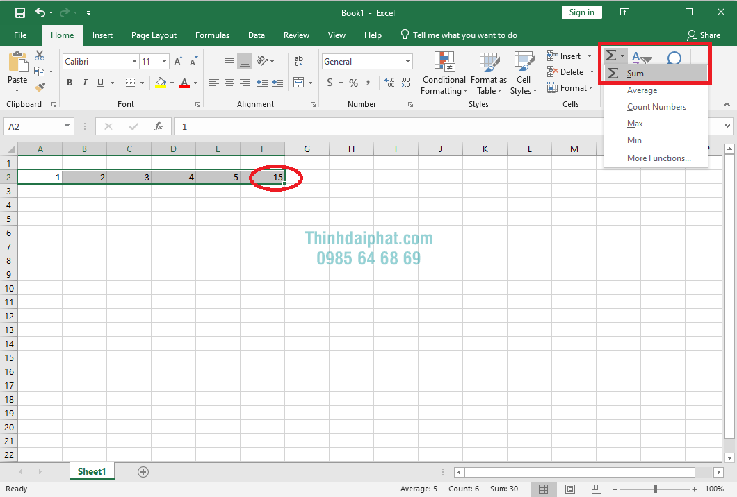Dưới đây là hình minh họa: Mình muốn tính tổng các số trong dãy từ A2 đến E2 thì ta sử dụng hàm =SUM(A2:E2) và nhấn Enter để hoàn thành thao tác. Ngoài ra các bạn có thể thực hiện như sau: nhấn hàm =SUM sau đó nhấn chuột phải kéo từ dãy A2 đến E2, sau đó nhấn Enter chúng ta sẽ nhận được kết quả tính tổng là 15.