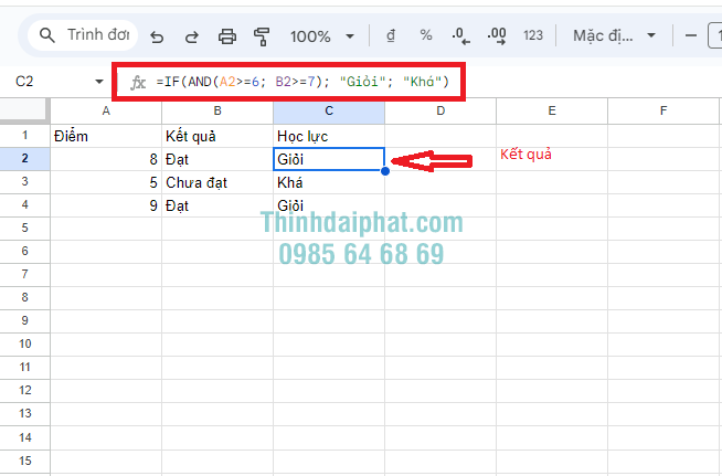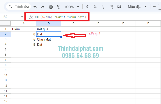 Công thức này sẽ kiểm tra xem điểm của học sinh (ở ô A2) có lớn hơn hoặc bằng 6 không. Nếu đúng, ô B2 sẽ hiển thị “Đạt”, ngược lại sẽ hiển thị “Chưa đạt”.