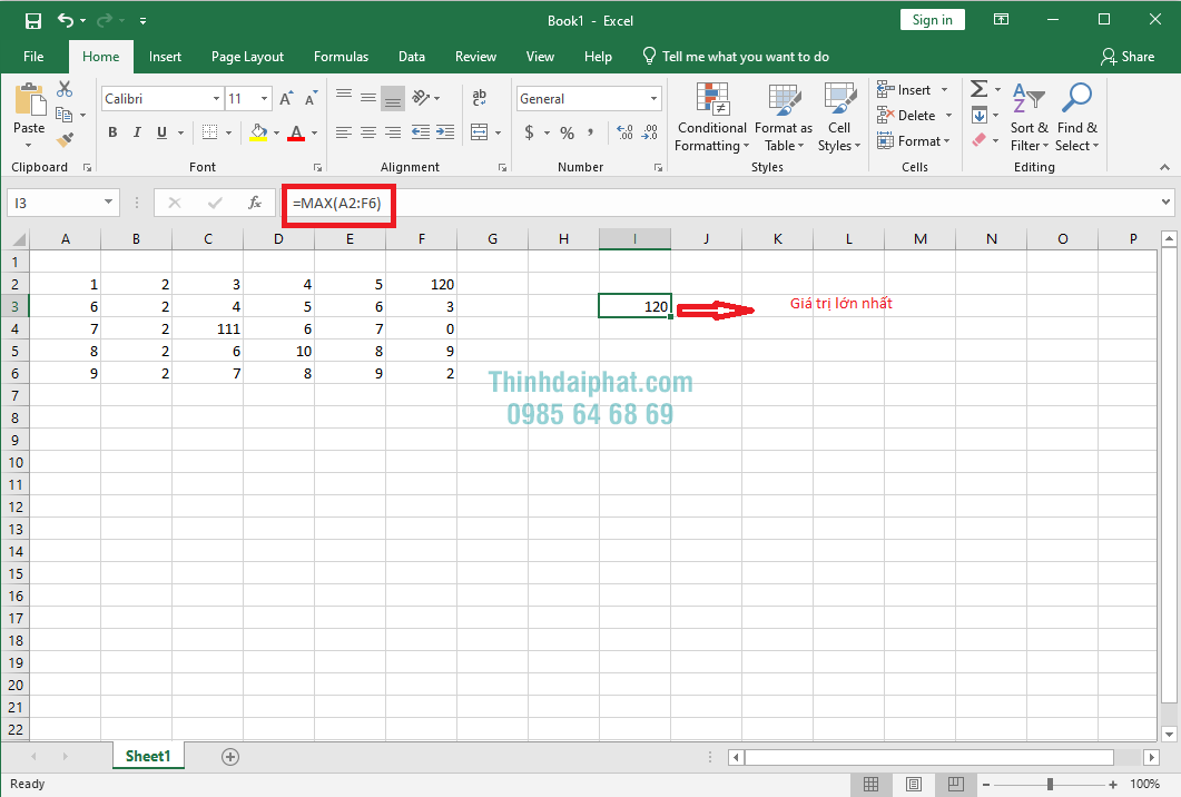 Dưới đây là hình minh họa: Mình muốn tìm một giá trị lớn nhất trong một phạm vi dữ liệu hay cả toàn bộ trang tính chúng ta sẽ áp dụng hàm =MAX(A2:F6) và nhấn Enter để hoàn thành thao tác và chúng ta sẽ nhận được giá trị lớn nhất là 120.