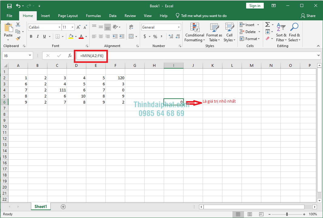 Dưới đây là hình minh họa: Mình muốn tìm một giá trị nhỏ nhất trong một phạm vi dữ liệu hay cả toàn bộ trang tính chúng ta sẽ áp dụng hàm =MIN(A2:F6) và nhấn Enter để hoàn thành thao tác và chúng ta sẽ nhận được giá trị nhỏ nhất là 0.